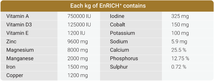 Chelated EnRICH+ is a feed supplement of highly bioavailable organic trace minerals, microminerals, vitamins, essential oils, and plant bio actives required by ruminants for optimum growth, production and performance.